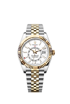 The Oyster Perpetual Sky‑Dweller in Oystersteel and yellow gold with an intense white dial and a Jubilee bracelet.