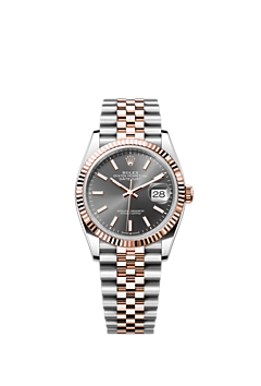 This Oyster Perpetual Datejust 36 in Oystersteel and Everose gold features a slate dial and a Jubilee bracelet.