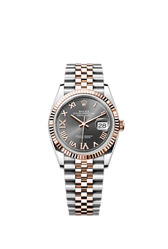 This Oyster Perpetual Datejust 36 in Oystersteel and Everose gold features a slate, diamond-set dial and a Jubilee bracelet.