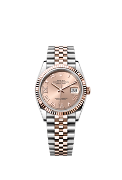 This Oyster Perpetual Datejust 36 in Oystersteel and Everose gold features a rosé colour, diamond-set dial and a Jubilee bracelet.