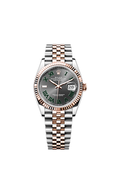 This Oyster Perpetual Datejust 36 in Oystersteel and Everose gold features a slate dial and a Jubilee bracelet.