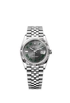 This Oyster Perpetual Datejust 36 in Oystersteel and white gold features a slate dial and a Jubilee bracelet.