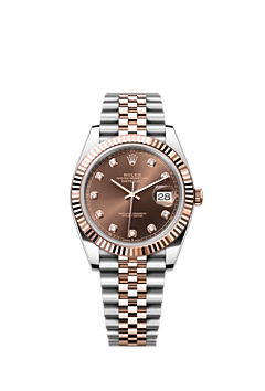 This Oyster Perpetual Datejust 41 in Oystersteel and Everose gold features a chocolate, diamond-set dial and a Jubilee bracelet.