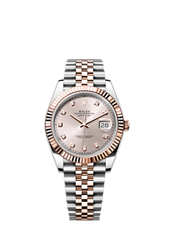 This Oyster Perpetual Datejust 41 in Oystersteel and Everose gold features a sundust, diamond-set dial and a Jubilee bracelet.