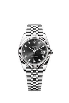 This Oyster Perpetual Datejust 41 in Oystersteel and white gold features a bright black, diamond-set dial and a Jubilee bracelet.