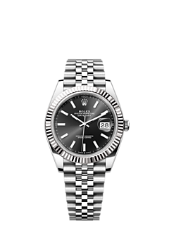 This Oyster Perpetual Datejust 41 in Oystersteel and white gold features a bright black dial and a Jubilee bracelet.