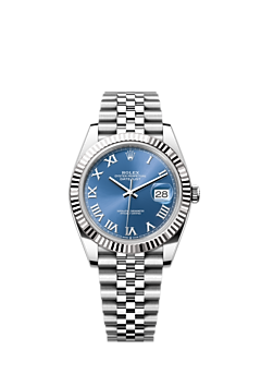This Oyster Perpetual Datejust 41 in Oystersteel and white gold features an azzurro-blue dial and a Jubilee bracelet.