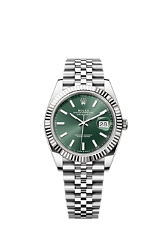 This Oyster Perpetual Datejust 41 in Oystersteel and white gold features a mint green dial and a Jubilee bracelet.