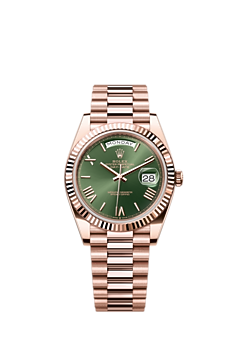 The Oyster Perpetual Day-Date 40 in 18 ct Everose gold with an olive-green dial, fluted bezel and a President bracelet.