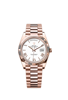 The Oyster Perpetual Day-Date 40 in 18 ct Everose gold with a white dial, fluted bezel and a President bracelet.