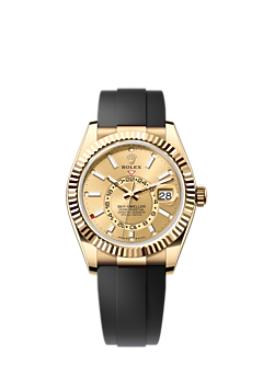 The Oyster Perpetual Sky‑Dweller in 18 ct yellow gold with a champagne-colour dial and an Oysterflex bracelet.