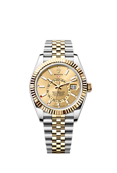 The Oyster Perpetual Sky‑Dweller in Oystersteel and yellow gold with a champagne-colour dial and a Jubilee bracelet.