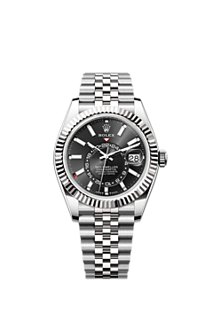 The Oyster Perpetual Sky‑Dweller in Oystersteel and white gold with a bright black dial and a Jubilee bracelet.