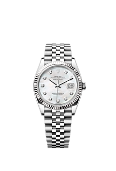 This Oyster Perpetual Datejust 36 in Oystersteel and white gold features a white mother-of-pearl, diamond-set dial and a Jubilee bracelet.