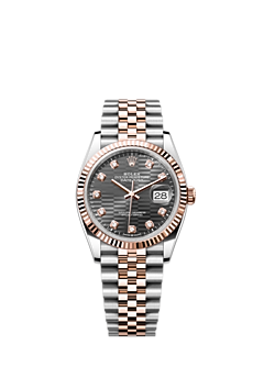 This Oyster Perpetual Datejust 36 in Oystersteel and Everose gold features a slate fluted-motif, diamond-set dial and a Jubilee bracelet.