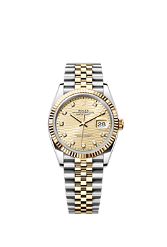 This Oyster Perpetual Datejust 36 in Oystersteel and yellow gold features a golden fluted-motif, diamond-set dial and a Jubilee bracelet.