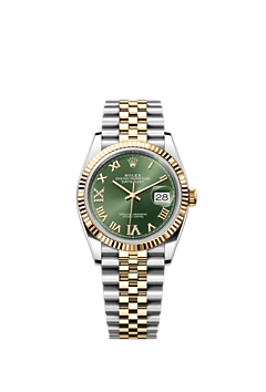 This Oyster Perpetual Datejust 36 in Oystersteel and yellow gold features an olive-green, diamond-set dial and a Jubilee bracelet.