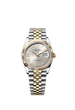 This Oyster Perpetual Datejust 36 in Oystersteel and yellow gold features a silver, diamond-set dial and a Jubilee bracelet.