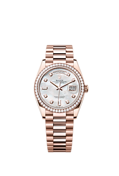 The Oyster Perpetual Day-Date 36 in 18 ct Everose gold, with a white mother-of-pearl, diamond-set dial, diamond-set bezel and a President bracelet.