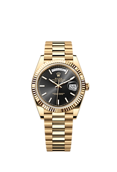 The Oyster Perpetual Day-Date 40 in 18 ct yellow gold with a bright black dial, fluted bezel and a President bracelet.