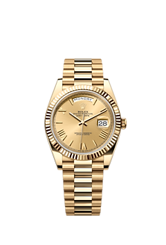 The Oyster Perpetual Day-Date 40 in 18 ct yellow gold with a champagne-colour dial, fluted bezel and a President bracelet.