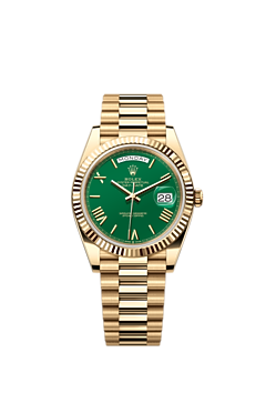 The Oyster Perpetual Day-Date 40 in 18 ct yellow gold with a green dial, fluted bezel and a President bracelet.