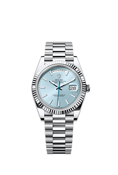 The Oyster Perpetual Day‑Date 40 in platinum with an ice-blue dial, fluted bezel and a President bracelet.