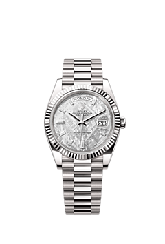 The Oyster Perpetual Day‑Date 40 in 18 ct white gold with a meteorite, diamond-set dial, fluted bezel and a President bracelet.