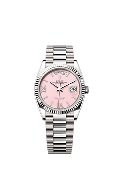 The Oyster Perpetual Day‑Date 36 in 18 ct white gold with a pink opal, diamond-set dial, fluted bezel and a President bracelet.