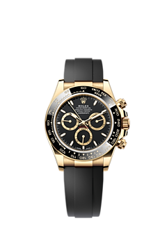 This Oyster Perpetual Cosmograph Daytona in 18 ct yellow gold with a black dial and an Oysterflex bracelet, features a black Cerachrom bezel with tachymetric scale.