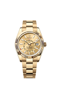 The Oyster Perpetual Sky‑Dweller in 18 ct yellow gold with a champagne-colour dial and an Oyster bracelet.