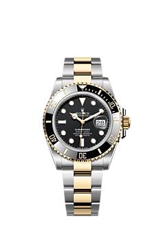 The Oyster Perpetual Submariner Date in Oystersteel and yellow gold with a Cerachrom bezel insert in black ceramic and a black dial with large luminescent hour markers.